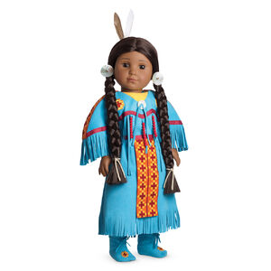 Mattel's American Girl has not been big on keeping up with painstaking historical detail, but I do love Kaya's parfleche. It is something not part of the common Native American stereotype like buckskins, moccasins, and feathered headdresses are. The bracelet is cute, too! I'm not a big fan of having my dolls wear hats (even though my girls did don them for Kaleia's birthday) and I do wish that the hat was like the Maplelea Girl Saila (made by actual Native Americans)... But Mattel is Mattel.