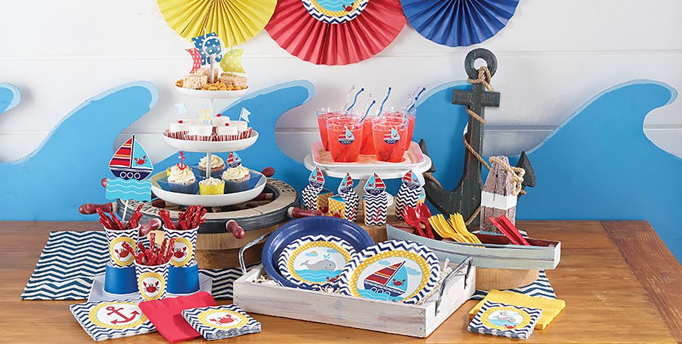 Anchors, sailboats, sea creatures, ship wheels, lifesavers, seashells. Color scheme: red, white and blue.